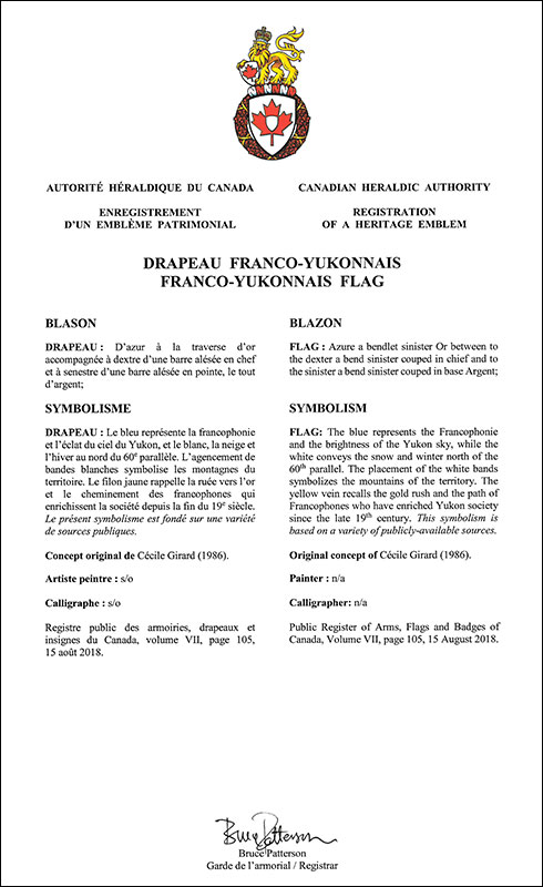 Drapeau franco-yukonnaisBlasonD’azur à la traverse d’or accompagnée à dextre d’une barre alésée en chef et à senestre d’une barre alésée en pointe, le tout d’argent; SymbolismeLe bleu représente la francophonie et l’éclat du ciel du Yukon, et le blanc, la neige et l’hiver au nord du 60e parallèle. L’agencement de bandes blanches symbolise les montagnes du territoire. Le filon jaune rappelle la ruée vers l’or et le cheminement des francophones qui enrichissent la société depuis la fin du 19e siècle. Le présent symbolisme est fondé sur une variété de sources publiques. |