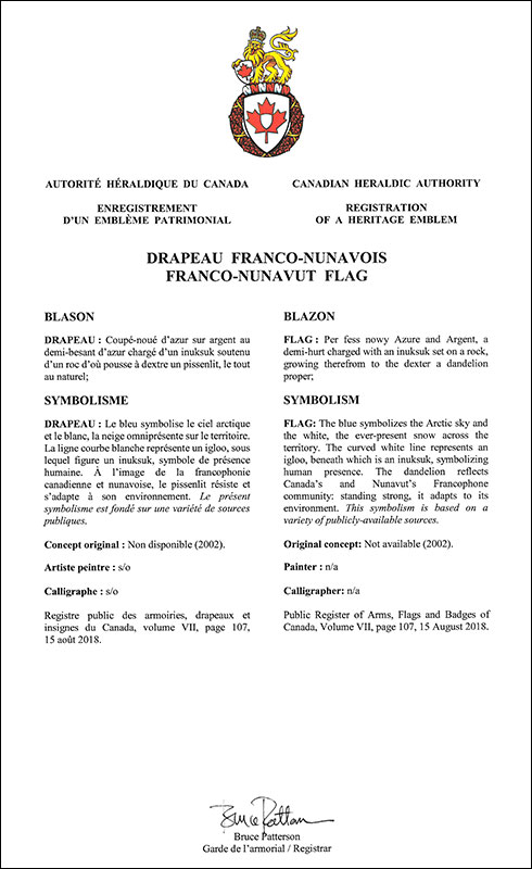 Drapeau franco-nunavoisBlasonCoupé-noué d’azur sur argent au demi-besant d’azur chargé d’un inuksuk soutenu d’un roc d’où pousse à dextre un pissenlit, le tout au naturel; SymbolismeLe bleu symbolise le ciel arctique et le blanc, la neige omniprésente sur le territoire. La ligne courbe blanche représente un igloo, sous lequel figure un inuksuk, symbole de présence humaine. À l’image de la francophonie canadienne et nunavoise, le pissenlit résiste et s’adapte à son environnement. Le présent symbolisme est fondé sur une variété de sources publiques. |