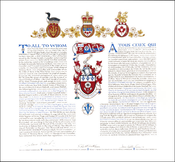 Armoiries de Richard Edward HildrethBlasonDe gueules à une branche de rosier fleurie de boutons et d'une rose, le tout d'argent, au chef du même chargé de trois phéons d'azur; SymbolismeLe rouge et le bleu sont les couleurs préférées de M. Hildreth. Elles font aussi allusion à ses ancêtres britanniques et américains. La rose représente ses ancêtres du Yorkshire en Angleterre et les boutons qu’elle semble protéger font allusion à sa carrière dans les services à l’enfance. Les trois phéons proviennent des armes d’autres familles Hildreth, notamment l’ancienne famille du Massachusetts dont M. Hildreth descend. |