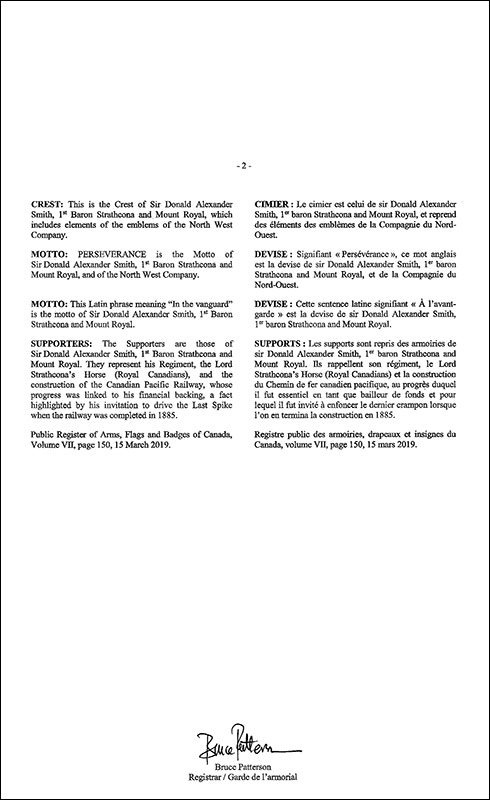 DeviseBlasonPERSEVERANCE; SymbolismeSignifiant « Persévérance », ce mot anglais est la devise de sir Donald Alexander Smith, 1er baron Strathcona and Mount Royal, et de la Compagnie du Nord-Ouest. |