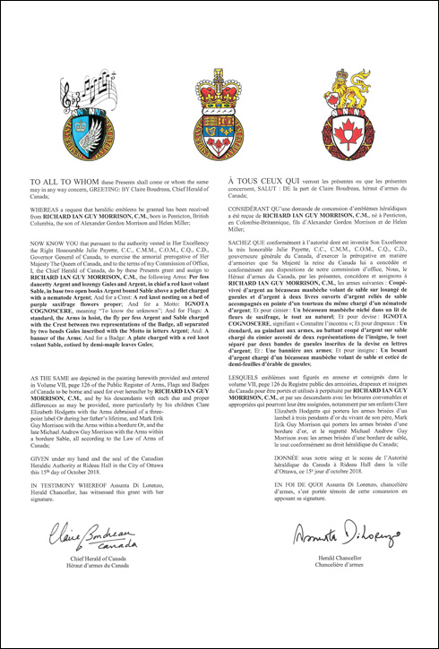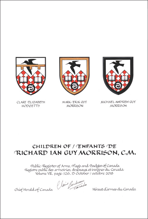 Concession d’armoiries, de drapeaux et d’un insigne, avec brisures à Clare Elizabeth Hodgetts, à Mark Erik Guy Morrison et à Michael Andrew Guy Morrison