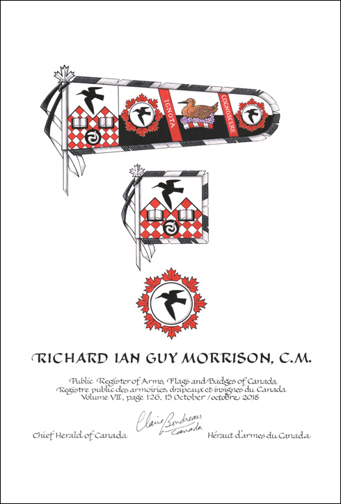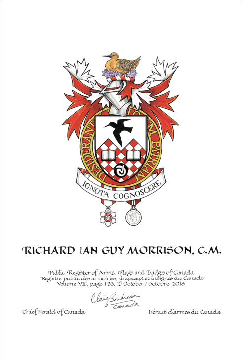 Armoiries de Richard Ian Guy MorrisonBlasonCoupé-vivré d’argent au bécasseau maubèche volant de sable sur losangé de gueules et d’argent à deux livres ouverts d’argent reliés de sable accompagnés en pointe d’un tourteau du même chargé d’un nématode d’argent; SymbolismeLa silhouette d’oiseau représente un bécasseau maubèche, espèce qui a été au cœur des recherches de M. Morrison sur les populations d’oiseaux de rivage. Les deux sommets font allusion aux caractéristiques géographiques de deux sites importants pour les travaux de M. Morrison, le mont Pullen et la colline Dean près d’Alert, au Nunavut, ainsi qu’aux deux collines situées à l’extrémité ouest de la baie Lomas, dans la Terre de Feu, au Chili. Elles forment aussi la lettre M, pour Morrison. Le motif en damier évoque le Réseau de réserves pour les oiseaux de rivage dans l’hémisphère occidental, projet de conservation créé par M. Morrison. Les livres font référence au parcours universitaire de M. Morrison et aux deux universités qu’il a fréquentées, St. Andrews et Cambridge. Le ver nématode, Skrjabinoclava morrisoni, est une espèce découverte en 1987 nommée en l’honneur de M. Morrison pour ses apports à la compréhension de la biologie des oiseaux de rivage. Le rouge et le blanc sont les couleurs du Canada et de l’Ordre du Canada, dont il est membre. |