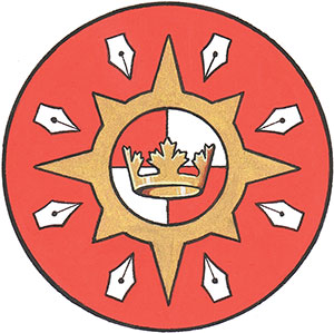 Insigne du secrétaire de La Société royale héraldique du CanadaBlason(Secrétaire) Un tourteau de gueules chargé de l’insigne de La Société royale héraldique du Canada environné de pointes de plume à réservoir d’argent, leurs pointes en abîme; Symbolisme(Secrétaire) Les becs de plume font état du rôle du secrétaire pour ce qui est de consigner l’information et de gérer la correspondance. |