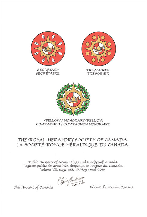 L'utilisation du contenu du Registre public est réservée à des fins de recherche uniquement. Les emblèmes héraldiques du Registre ne peuvent être reproduits sous aucune forme ou par quelque procédé que ce soit sans l'autorisation écrite de l'Autorité héraldique du Canada et/ou du récipiendaire.