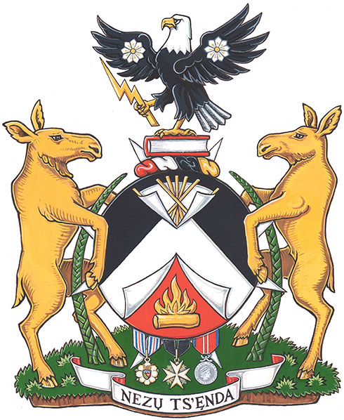 DeviseBlasonNEZŲ TS’ĘNDA; SymbolismeCette sentence, qui signifie une « vie équilibrée » en déné zhatıé, reflète la croyance de la commissaire Thom selon laquelle chacun est responsable de son propre bien-être. |