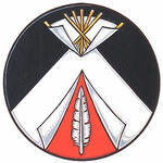 Armoiries brisées de Lee Maria Thom, enfant de Margaret ThomBlasonLes armoiries de Margaret Thom brisées d’une plume coupée d’or sur argent posée en pal au lieu du feu de camp; SymbolismeLa plume dans l’écu de chacune des filles de la commissaire Thom est un symbole sacré, en lien avec l’aigle du cimier. |