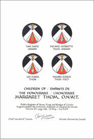 Concession d’armoiries et de supports, avec brisures à Tina Marie Gargan, à Melanie Georgette Thom-Gargan, à Lee Maria Thom et à Tamara Rosalie Thom-Field