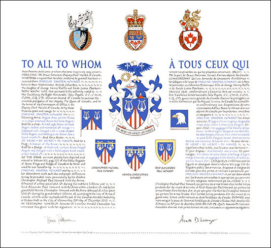 Concession d’armoiries, d’un drapeau et d’un insigne, avec brisures à Christopher Michael Paul Howard, à Reid Alexander Paul Howard et à Henrik Christopher Howard