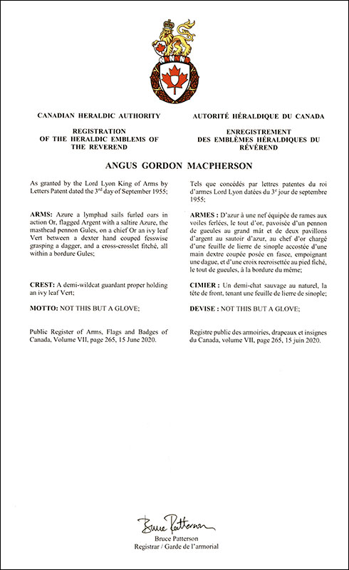 Armoiries d'Angus Gordon MacphersonBlasonD’azur à une nef équipée de rames aux voiles ferlées, le tout d’or, pavoisée d’un pennon de gueules au grand mât et de deux pavillons d’argent au sautoir d’azur, au chef d’or chargé d’une feuille de lierre de sinople accostée d’une main dextre coupée posée en fasce, empoignant une dague, et d’une croix recroisettée au pied fiché, le tout de gueules, à la bordure du même; SymbolismeLes couleurs, le navire, la main tenant un poignard ainsi que la croix sont repris des armoiries du chef du clan Macpherson. Le navire, inspiré des armoiries des seigneurs des Îles, figure dans de nombreuses armoiries des Highlands occidentales, en Écosse. Ses pavillons rappellent le drapeau de la Nouvelle-Écosse, province natale de M. Macpherson. La croix est une référence ecclésiastique, puisque le nom Macpherson dérive de l’expression « fils du pasteur » en gaélique écossais. La main et le poignard rappellent le rôle du clan Macpherson dans la victoire sur le clan Cummings de Badenoch, ennemi du roi Robert Ier d’Écosse, au début du XIVe siècle. La feuille de lierre figure dans l’insigne du clan Gordon, ce nom étant l’un des prénoms de M. Macpherson. Conformément aux brisures de l’héraldique écossaise, la bordure rouge signifie que M. Macpherson est le quatrième fils de la famille. |