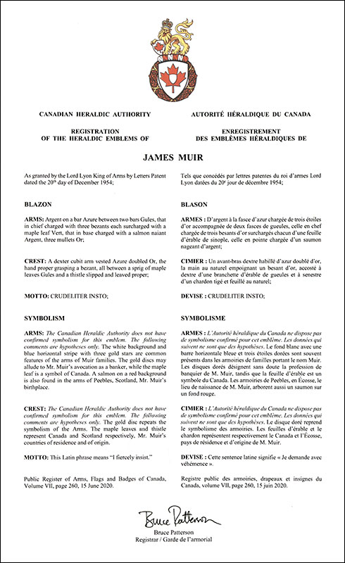 Armoiries de James MuirBlasonD’argent à la fasce d’azur chargée de trois étoiles d’or accompagnée de deux fasces de gueules, celle en chef chargée de trois besants d’or surchargés chacun d’une feuille d’érable de sinople, celle en pointe chargée d’un saumon nageant d’argent; SymbolismeL’Autorité héraldique du Canada ne dispose pas de symbolisme confirmé pour cet emblème. Les données qui suivent ne sont que des hypothèses. Le fond blanc avec une barre horizontale bleue et trois étoiles dorées sont souvent présents dans les armoiries de familles portant le nom Muir. Les disques dorés désignent sans doute la profession de banquier de M. Muir, tandis que la feuille d’érable est un symbole du Canada. Les armoiries de Peebles, en Écosse, le lieu de naissance de M. Muir, arborent aussi un saumon sur un fond rouge. |