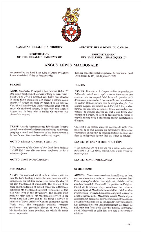 Armoiries d'Angus Lewis MacdonaldBlasonÉcartelé, au 1 d’argent au lion de gueules, au 2 d’or à la main dextre coupée posée en fasce tenant une croix recroisettée au pied fiché, le tout de gueules, au 3 d’or au navire aux voiles ferlées de sable, ses rames levées en sautoir, flottant sur une mer de sinople chargée d’un saumon nageant au naturel, au 4 d’argent à l’aigle d’or perchée sur un chêne de sinople, le tout enclos dans une bordure de gueules chargée en chef d’une flèche d’or empennée d’argent, en fasce de deux ancres du même et en pointe d’une étoile d’or accostée de deux quintefeuilles d’argent; SymbolismeL’écu dans ces couleurs, écartelé avec un lion, une main tenant une croix, un bateau et un saumon dans l’eau, ainsi qu’un chêne et un aigle, est celui du chef du clan Macdonald de Clanranald. La position de l’aigle et l’ajout de la bordure rouge constituent des brisures, indiquant que M. Macdonald descend d’un chef de ce clan ayant vécu au 16e siècle. Les ancres soulignent sans aucun doute le service de M. Macdonald dans la Marine royale canadienne et celui de son père comme ministre canadien des Affaires navales lors de la Seconde Guerre mondiale. Les quintefeuilles sont vraisemblablement des fleurs de mai, emblème floral de la Nouvelle-Écosse, la province de M. Macdonald et celle dont son père a été premier ministre. |