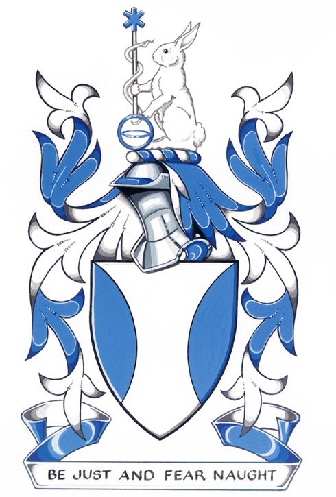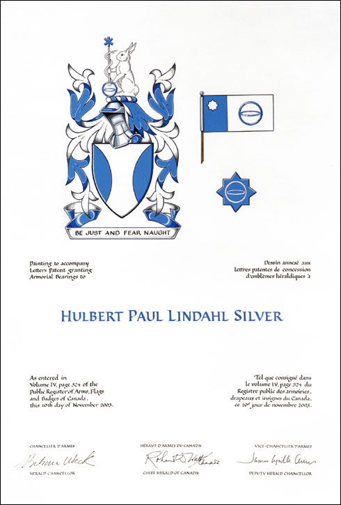 CimierBlasonUn lapin d'argent assis tenant de sa patte dextre un bâton d'Esculape du même sommé de trois billettes d'azur posées en pal et en sautoir, sa patte senestre reposant sur un anneau enfilé d'un autre anneau, le tout du même; SymbolismeM. Silver a débuté sa carrière comme travailleur paramédical pour ensuite devenir médecin. L’astérisque bleu formé de trois rectangles est l’étoile de vie, symbole des services paramédicaux, le bâton au serpent est le symbole de la médecine. Le lapin est d’un intérêt particulier pour M. Silver. Les anneaux évoquent ses convictions philosophiques reflétées aussi dans la description de l’insigne. Ce jeu d’anneaux représente également la science qui est le fondement de la médecine. |