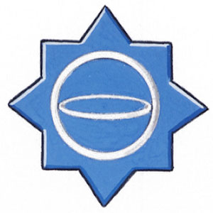 Insigne de Hulbert Paul Lindahl SilverBlasonUne étoile à huit rais d'azur chargée d'une paire d'anneau d'argent comme dans le cimier; SymbolismeLe carré bleu établit un lien entre le prénom Hulbert et un drapeau du même nom (Hulbert Flag). M. Silver est aussi fervent de la logique et de la méthode scientifique qu’il représente souvent par le chiffre quatre. Ces notions se retrouvent dans les quatre côtés du carré et dans le jeu d’anneaux. Vu en trois dimensions, chaque anneau représente une surface plane intersectée par une autre surface plane à angle droit, ce qui, si vu de côté laisse voir quatre quadrants. |