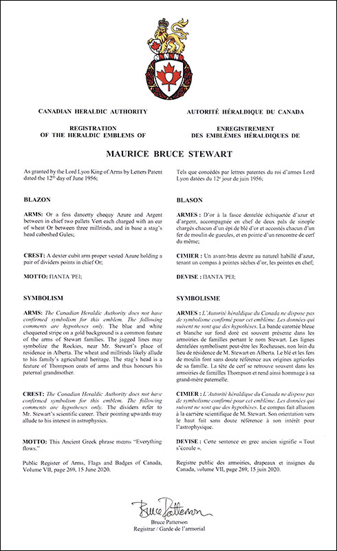 Armoiries de Maurice Bruce StewartBlasonD’or à la fasce dentelée échiquetée d’azur et d’argent accompagnée en chef de trois fers de moulin de gueules séparés par deux pals de sinople, chargés chacun d’un épi de blé d’or, et en pointe d’un rencontre de cerf de gueules; SymbolismeL’Autorité héraldique du Canada ne dispose pas de symbolisme confirmé pour cet emblème. Les données qui suivent ne sont que des hypothèses. La bande à carreaux bleue et blanche sur fond doré est souvent présente dans les armoiries de familles portant le nom Stewart. Les lignes dentelées symbolisent peut-être les Rocheuses, non loin du lieu de résidence de M. Stewart en Alberta. Le blé et les fers de moulin font sans doute référence aux origines agricoles de sa famille. La tête de cerf se retrouve souvent dans les armoiries de familles Thompson et rend ainsi hommage à sa grand-mère paternelle. |