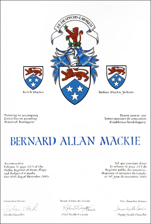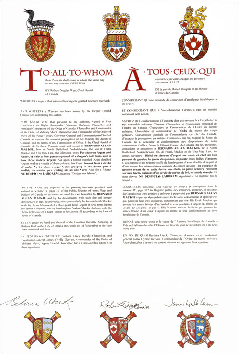 Concession d'armoiries, avec brisures à Keith Mackie et à Nadina Mackie Jackson