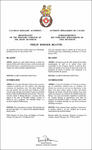 Informations additionnellesCréateur(s)Non disponible. Artiste-peintreNon disponible CalligrapheNon disponible Type de récipiendaireIndividuel Autres renseignementsLes emblèmes du récipiendaire ont été précédemment consignés dans les archives de la Cour du roi d’armes Lord Lyon, à Édimbourg, en Écosse, le 15 mai 1959. |