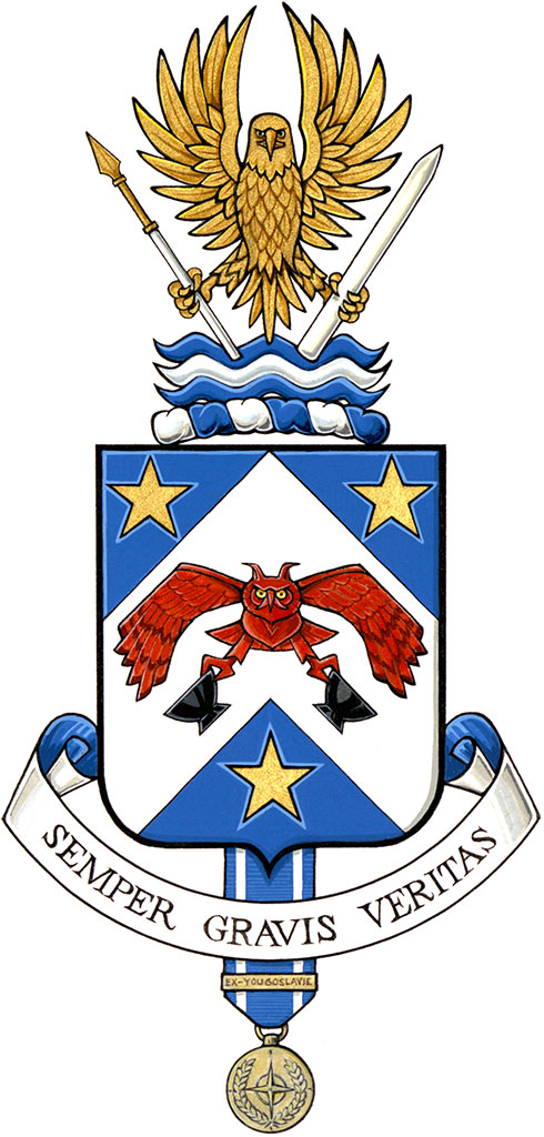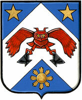 Armoiries de Yan J. Kevin BolducBlasonD’azur au chevron d’argent chargé d’un grand-duc volant de gueules posé de front tenant dans chaque serre un bol de sable, le tout accompagné de trois étoiles d’or; SymbolismeLes bols et le grand-duc sont une allusion parlante au nom de M. Bolduc. Ces éléments sont inspirés des armoiries parlantes de son ancêtre l’apothicaire-épicier parisien Pierre Boulduc (1607-1670), arborant des boules et un grand-duc. Le bleu représente ici le ciel et les origines françaises de la famille. Le chevron évoque la forme stylisée d’un avion chasseur moderne, représentant la carrière de M. Bolduc dans l’armée de l’air et son rôle d’instructeur dans ce domaine. Les étoiles représentent ses trois enfants. |