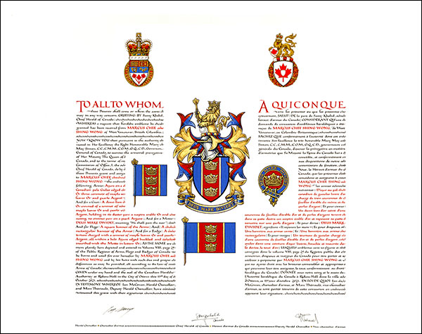 Arrmoiries de Marcus Chee Shing WongBlasonD’azur au pal canadien de gueules liséré d’or chargé de trois couronnes de feuilles d’érable du même et de perles d’argent; SymbolismeLe rouge, l’or et le bleu sont les couleurs de l’Université Queen’s, à Kingston (Ontario), et de l’Université de Birmingham (Royaume-Uni), deux établissements que M. Wong a fréquentés. Le large bandeau vertical au milieu de l’écu, appelé « pal canadien » en héraldique, fait écho à la devise et à l’identité canadienne de M. Wong. La forme des couronnes, semblable à celle d’un marquis, se prête à un jeu de mots avec son prénom, Marcus. Les feuilles d’érable et les perles des couronnes évoquent son identité canadienne et ses racines familiales à Hong Kong, surnommée la « perle de l’Orient ». |