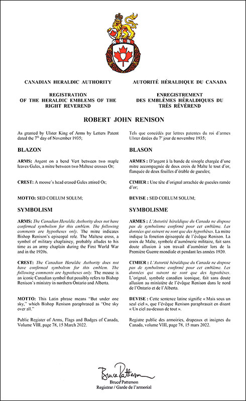 Armoiries de Robert John RenisonBlasonD’argent à la bande de sinople chargée d’une mitre accompagnée de deux croix de Malte d’or, flanquée de deux feuilles d’érable de gueules; SymbolismeL’Autorité héraldique du Canada ne dispose pas de symbolisme confirmé pour cet emblème. Les données qui suivent ne sont que des hypothèses. La mitre indique la fonction épiscopale de l’évêque Renison. La croix de Malte, symbole d’aumônerie militaire, fait sans doute allusion à son travail d’aumônier lors de la Première Guerre mondiale et pendant les années 1920. |