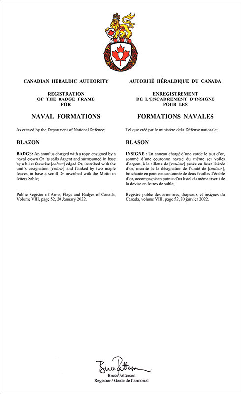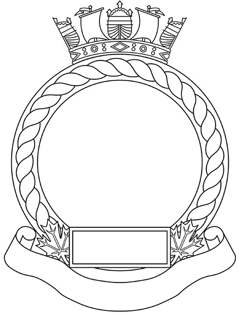 Encadrement d'insigne pour les formations navales des Forces armées canadiennesBlasonUn anneau chargé d’une corde le tout d’or, sommé d’une couronne navale du même ses voiles d’argent, à la billette de [couleur] posée en fasce lisérée d’or, inscrite de la désignation de l’unité de [couleur], brochante en pointe et cantonnée de deux feuilles d’érable d’or, accompagné en pointe d’un listel du même inscrit de la devise en lettres de sable; SymbolismeLa plupart des insignes des Forces armées canadiennes sont contenus dans un encadrement d'insigne servant à identifier rapidement le type d’unité et ses fonctions. Le présent encadrement d'insigne accompagne des insignes primaires. |