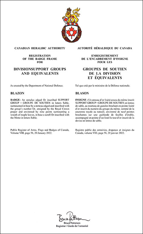 Encadrement d'insigne pour les groupes de soutien de la division et équivalents des Forces armées canadiennesBlasonUn anneau d’or liséré-cousu du même inscrit SUPPORT GROUP • GROUPE DE SOUTIEN en lettres de sable, au tourteau de gueules brochant en pointe liséré d’or inscrit du numéro du groupe du même, sommé de la couronne royale au naturel, environné de neuf pointes brochantes sur une guirlande de feuilles d’érable, accompagné en pointe d’un listel le tout d’or inscrit de la devise en lettres de sable; SymbolismeLa plupart des insignes des Forces armées canadiennes sont contenus dans un encadrement d'insigne servant à identifier rapidement le type d’unité et ses fonctions. Le présent encadrement d'insigne accompagne des insignes primaires. |