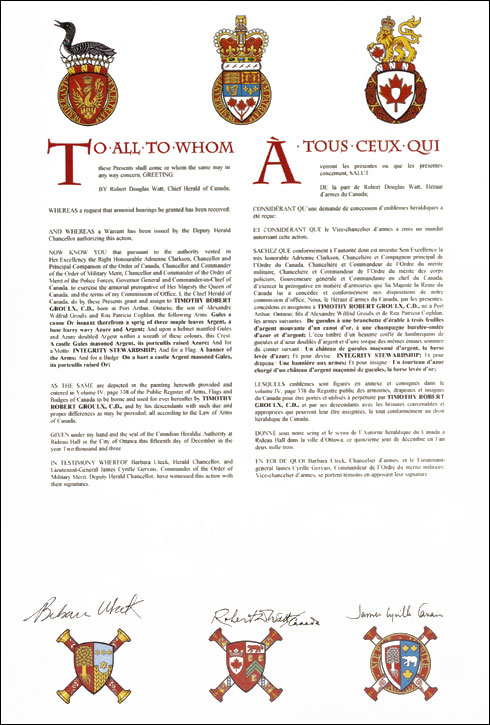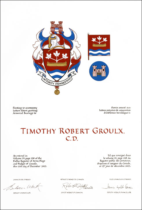 Armoiries de Timothy Robert GroulxBlasonDe gueules à une branchette d'érable à trois feuilles d'argent mouvante d'un canot d'or, à une champagne burelée-ondée d'azur et d'argent; SymbolismeLe canot représente l’enthousiasme du capitaine Groulx pour le canotage et son dévouement envers les jeunes au sein d’activités récréatives et athlétiques. Les rayures ondulées rappellent les eaux près de sa demeure sur le lac Supérieur. Les trois feuilles d’érable se réfèrent à la Mention élogieuse qu’il a reçue du chef d’état major de la Défense. Le rouge et le blanc sont les couleurs nationales du Canada et symbolisent les services que le capitaine Groulx a rendus au pays dans plusieurs domaines. |
