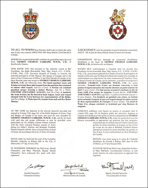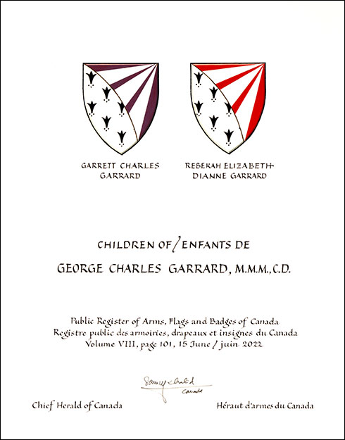 Concession d’armoiries, d’un drapeau et d’un insigne, avec brisures à Garrett Charles Garrard et à Rebekah Elizabeth Dianne Garrard