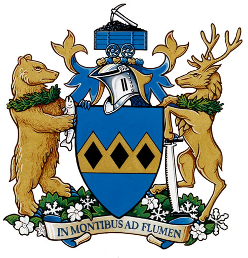 SupportsBlasonÀ dextre, un grizzli d'or colleté d'un collier de cèdre de sinople, tenant de sa patte dextre une truite d'argent, à senestre, un wapiti d'or pareillement colleté, sa patte antérieure senestre reposant sur une scie à tronçonner d'argent, les poignées de sable, les supports debout sur un monticule herbeux de sinople orné de flocons de neige et de fleurs de cornouiller, le tout d'argent; SymbolismeLe wapiti et le grizzli sont des grands mammifères communs à la région. Le wapiti (elk en anglais) fait allusion au nom de la vallée où est située la ville. Les deux animaux représentent aussi la richesse naturelle des environs de Fernie. Les colliers de cèdre rappellent les peuplements de cèdres régionaux, les arbres les plus grands de la province après ceux du littoral du Pacifique. La truite souligne l’importance de la pêche récréative locale et la scie reflète l’importance grandissante de l’industrie forestière. La terrasse herbeuse symbolise les terrains de la ville. Les fleurs de cornouiller indiquent que la ville est en Colombie-Britannique. Les flocons de neige mettent en relief l’importance grandissante des activités récréatives d’hiver. |