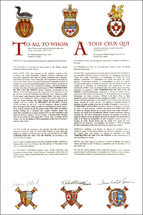 Informations additionnellesCréateur(s)Concept original de Robert D. Watt, Héraut d’armes du Canada, assisté par les hérauts de l'Autorité héraldique du Canada Artiste-peintreDavid Farrar CalligrapheShirley Mangione Type de récipiendaireInstitution civile