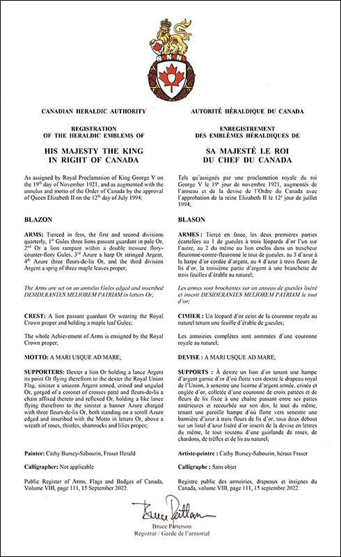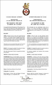 Enregistrement des armoiries et des supports de Sa Majesté le roi du chef du Canada
