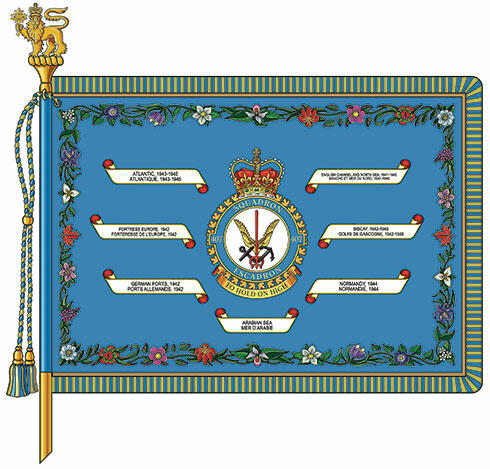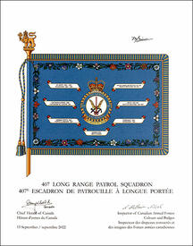 Drapeau du 407e Escadron de patrouille à longue portéeBlasonL’étendard d’un escadron de l’Aviation royale canadienne à l’insigne du 407e Escadron de patrouille à longue portée (D’argent au trident de gueules ailé d’or, les pointes en pointe brisant en deux une ancre de sable, le tout environné de l’encadrement d’insigne pour les escadrons aériens, son listel inscrit TO HOLD ON HIGH) accompagné de listels d’argent inscrits en lettres de sable, ceux à dextre inscrits ATLANTIC, 1943 - 1945 / ATLANTIQUE, 1943 - 1945; FORTRESS EUROPE, 1942 / FORTERESSE DE L’EUROPE, 1942; GERMAN PORTS, 1942 / PORTS ALLEMANDS, 1942; ceux à senestre inscrits ENGLISH CHANNEL AND NORTH SEA, 1941-1945 / MANCHE ET MER DU NORD, 1941-1945; BISCAY, 1942-1945 / GOLFE DE GASCOGNE, 1942-1945; NORMANDY, 1944 / NORMANDIE, 1944; et celui en pointe inscrit ARABIAN SEA / MER D’ARABIE; SymbolismeL’insigne désigne l’unité. Les banderoles arborent les honneurs de bataille décernés à l’unité. |
