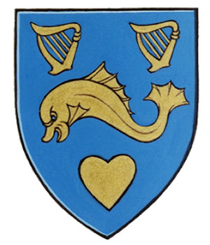 Armoiries de Rory Henry Grattan FisherBlasonD'azur au dauphin nageant accompagné en chef de deux harpes et, en pointe, d'une croix ancrée, le tout d'or; SymbolismeLe dauphin représente la municipalité de Brighton en Angleterre où le Dr Fischer a grandi. Par ailleurs, comme le dauphin héraldique a l’allure d’un gros poisson (fish en anglais), il comporte une allusion héraldique au nom Fisher. La croix aux extrémités ancrées a été choisie pour représenter son école, Downside School, et les harpes font allusion aux ascendances irlandaises du Dr Fischer et de son épouse. |