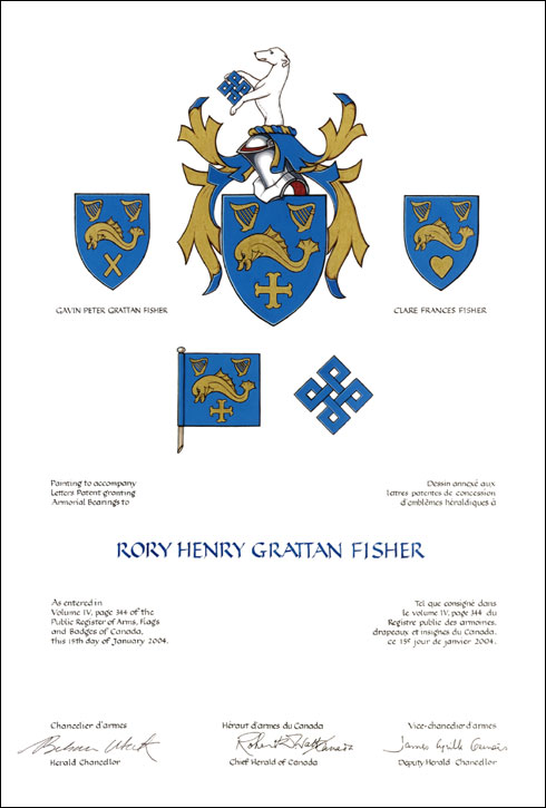 Concession d'armoiries, d'un drapeau et d'un insigne, avec brisures à Gavin Peter Gratten Fisher et à Clare Frances Fisher