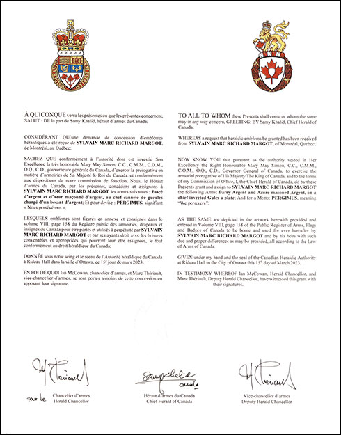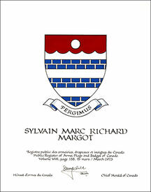 Armoiries de Sylvain Marc Richard MargotBlasonFascé d’argent et d’azur maçonné d’argent, au chef cannelé de gueules chargé d’un besant d’argent; SymbolismeLes bandes blanches et bleues sont inspirées des armoiries d’Ahun, en France, canton de résidence de la famille de M. Margot depuis le 16e siècle. Le motif de briques rappelle qu’il est issu d’une longue lignée de maçons, un métier toujours exercé par certains membres de sa famille. La couleur rouge rend hommage aux nombreux Margot qui ont combattu pour défendre la France. Tel un rideau qu’on soulève pour révéler un trésor, cette section rouge exprime aussi l’attachement de M. Margot envers sa communauté natale ainsi que sa volonté d’en protéger le patrimoine culturel et artistique. Enfin, le disque blanc évoque à la fois une ronde et une perle. La ronde souligne la carrière de M. Margot en enseignement de la théorie musicale. La perle fait écho au patronyme Margot. En effet, la famille tire son nom de la paroisse Sainte-Marguerite de Cressat (France), Marguerite signifiant « perle » en latin et en grec. |