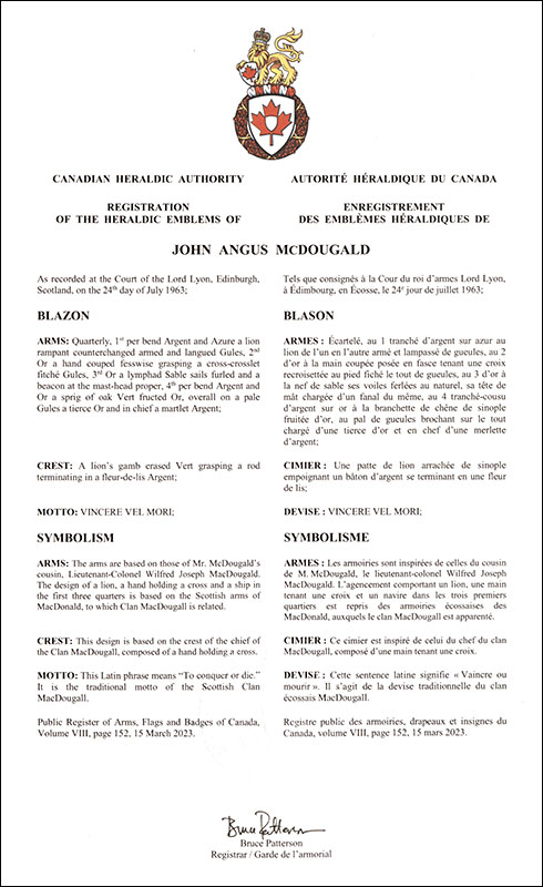 Armoiries de John Angus McDougaldBlasonÉcartelé, au 1 tranché d’argent sur azur au lion de l’un en l’autre armé et lampassé de gueules, au 2 d’or à la main coupée posée en fasce tenant une croix recroisettée au pied fiché le tout de gueules, au 3 d’or à la nef de sable ses voiles ferlées au naturel, sa tête de mât chargée d’un fanal du même, au 4 tranché-cousu d’argent sur or à la branchette de chêne de sinople fruitée d’or, au pal de gueules brochant sur le tout chargé d’une tierce d’or et en chef d’une merlette d’argent; SymbolismeLes armoiries sont inspirées de celles du cousin de M. McDougald, le lieutenant-colonel Wilfred Joseph MacDougald. L’agencement comportant un lion, une main tenant une croix et un navire dans les trois premiers quartiers est repris des armoiries écossaises des MacDonald, auxquels le clan MacDougall est apparenté. |