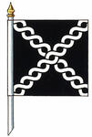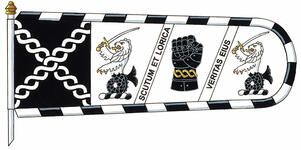 Drapeau de Sean Mark ConnollyBlasonUn étendard, au guindant aux armes, au battant d’argent chargé de l’insigne accosté de deux représentations du cimier, le tout séparé par deux barres d’argent lisérées et inscrites de la devise le tout de sable; SymbolismeLe symbolisme de cet emblème est compris dans un ou plusieurs éléments de ce dossier. |