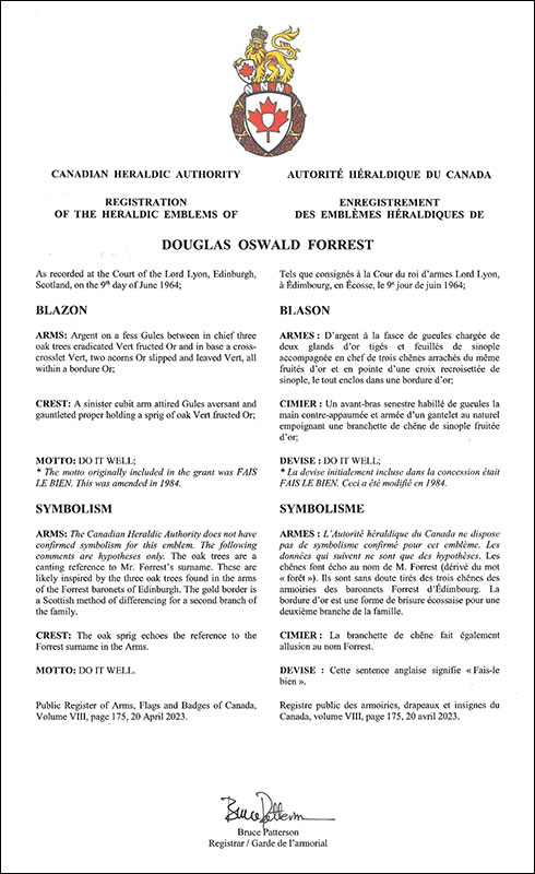 Armoiries de Douglas Oswald ForrestBlasonD’argent à la fasce de gueules chargée de deux glands d’or tigés et feuillés de sinople accompagnée en chef de trois chênes arrachés du même fruités d’or et en pointe d’une croix recroisettée de sinople, le tout enclos dans une bordure d’or; SymbolismeL’Autorité héraldique du Canada ne dispose pas de symbolisme confirmé pour cet emblème. Les données qui suivent ne sont que des hypothèses. Les chênes font écho au nom de M. Forrest (dérivé du mot « forêt »). Ils sont sans doute tirés des trois chênes des armoiries des baronnets Forrest d’Édimbourg. La bordure d’or est une forme de brisure écossaise pour une deuxième branche de la famille. |