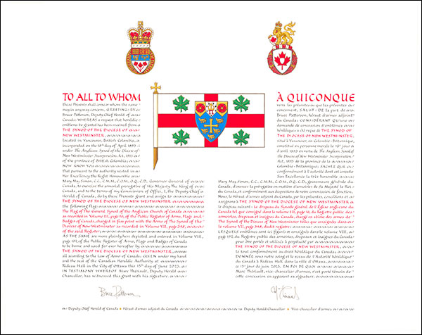 Drapeau de The Synod of the Diocese of New WestminsterBlasonLe drapeau du Synode général de l’Église anglicane du Canada tel que consigné dans le volume III, page 16, du Registre public des armoiries, drapeaux et insignes du Canada, chargé en abîme des armes de The Synod of the Diocese of New Westminster telles que consignées dans le volume VII, page 348, dudit registre; SymbolismeLa disposition des armoiries du diocèse au centre du drapeau de l’Église anglicane du Canada épouse celle utilisée dans d’autres drapeaux de diocèses anglicans du Canada. |