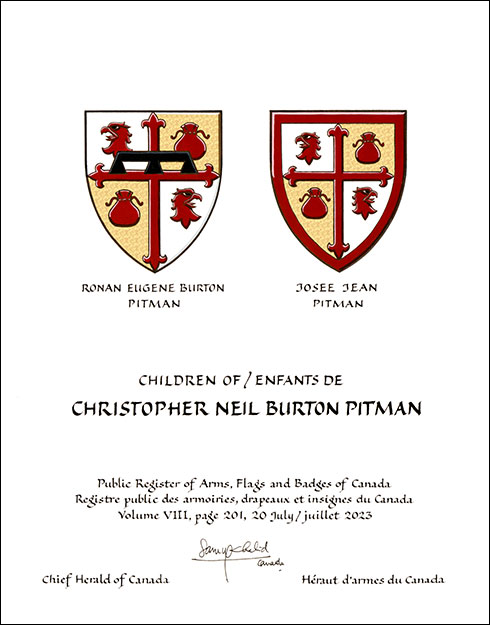 Concession d’armoiries, d’un drapeau et d’un insigne, avec brisures à Ronan Eugene Burton Pitman et à Josee Jean Pitman