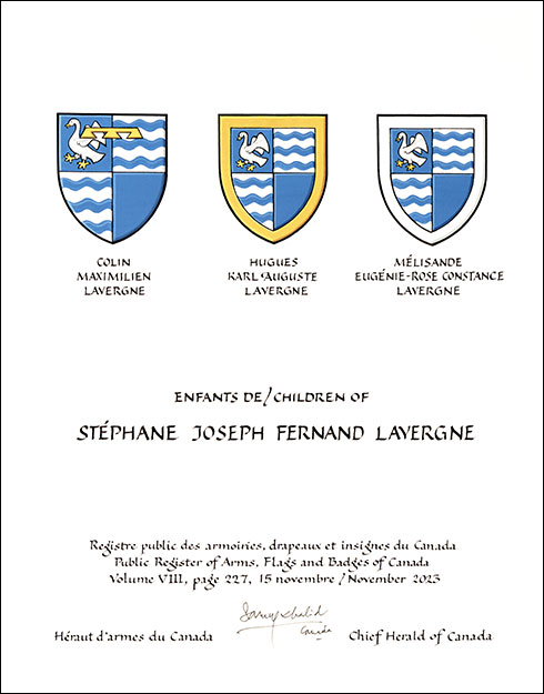 Concession d’armoiries et d’un drapeau, avec brisures à Colin Maximilien Lavergne, à Hugues Karl Auguste Lavergne et à Mélisande Eugénie-Rose Constance Lavergne