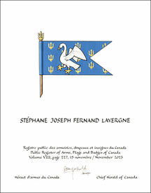 CimierBlasonUn cygne éployé au naturel tenant dans son bec une feuille d’aulne d’or et naissant d’un cercle de fers de trident du même; SymbolismeLe cygne reprend le symbolisme des armoiries. Le trident souligne le rôle de M. Lavergne au sein de la Marine royale canadienne en tant qu’officier instructeur ainsi que l’expérience de ses trois enfants en tant que cadets de la marine. La feuille d’aulne – aussi appelé « vergne » – fait écho au nom de famille Lavergne. |