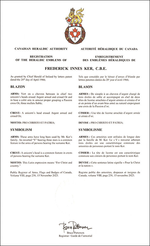 Armoiries de Frederick Innes KerBlasonDe sinople à un chevron d’argent chargé de trois étoiles de sable et accompagné en chef de deux têtes de licorne arrachées d’argent armées et crinées d’or et en pointe d’un avant-bras armé au naturel empoignant une croix de la Passion d’or; SymbolismeCes armoiries sont utilisées de longue date par la famille de M. Ker. Le « V » renversé arborant trois étoiles est une caractéristique commune des armoiries de personnes portant le nom Ker. |