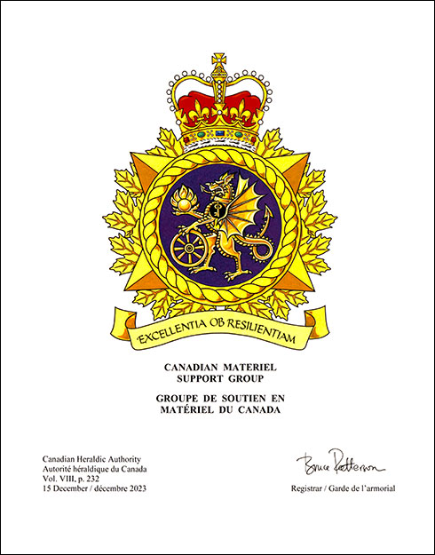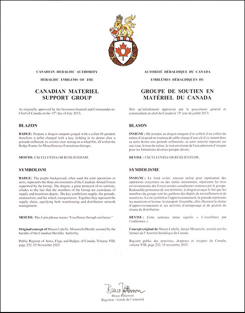 Insigne du Groupe de soutien en matériel du CanadaBlasonDe pourpre au dragon rampant d’or colleté d’un collier du même d’où pend un tourteau de sable chargé d’une clé d’or, tenant dans sa serre dextre une grenade enflammée, sa serre senestre reposant sur une roue, le tout du même, le tout environné de l’encadrement d’insigne pour les formations diverses/groupes divers; SymbolismeLe fond violet, souvent utilisé pour représenter des opérations conjointes ou des unités interarmées, représente les trois environnements des Forces armées canadiennes soutenus par le groupe. Redoutable protecteur de son territoire, le dragon évoque le fait que les membres du groupe sont les gardiens des dépôts de ravitaillement et de munitions. La clé symbolise l’approvisionnement, la grenade représente les munitions et la roue, le transport. Ensemble, elles illustrent la chaîne d’approvisionnement et ses activités d’entreposage et de gestion du réseau de distribution. |