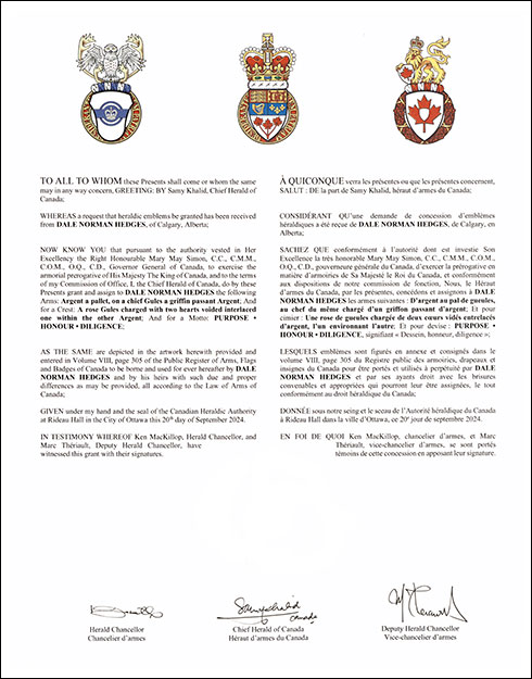 Armoiries de Dale Norman HedgesBlasonD’argent au pal de gueules, au chef du même chargé d’un griffon passant d’argent; SymbolismeLe rouge et le blanc rappellent le drapeau de Saint-Georges, le saint patron de l’Angleterre, et rendent ainsi hommage au pays des ancêtres de M. Hedges. La bande rouge verticale représente leur parcours pour émigrer au Canada, et celle horizontale, les nombreuses perspectives qui se sont présentées à eux dans leur pays d’adoption. Considéré comme le gardien des trésors depuis l’Antiquité, le griffon possède une nature protectrice qui évoque le travail de M. Hedges en tant qu’expert-comptable et consultant en gestion, deux activités qui requièrent la protection des renseignements et des avoirs de ses clients. |