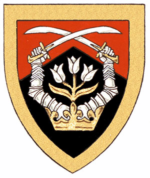 Armoiries de Robert Adam de BartokBlasonDivisé-cousu en chevron haussé de gueules sur sable à trois lis d’argent sur une tige feuillée d’or et environnés de deux bras armés ployés au naturel brandissant chacun un sabre de hussard d’argent garni d’or, les deux sabres passés en sautoir, le tout mouvant d’une couronne à l’ancienne du même; SymbolismeLes trois lis émergeant d’une couronne proviennent des armoiries de l’aïeul du capitaine de Bartok, le révérend Pál Bartók de Görgő et Zádorfalva. Les bras en armure tenant des sabres de hussard croisés sont tirés des armoiries de l’arrière-grand-mère paternelle du capitaine de Bartok, Gabrielle Zay de Csömör. Ils représentent la protection et font allusion aux nombreux membres de sa famille qui ont servi dans l’armée, notamment les trois générations les plus récentes au Canada. Pour M. de Bartok, les couleurs représentent l’adversité (noir), les ancêtres (rouge), l’espoir (blanc) et la noblesse (or). La ligne de séparation pointant vers le haut symbolise la quête perpétuelle de la vertu. |
