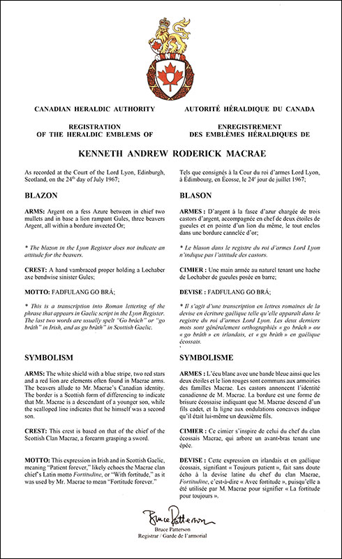 SymbolismeL’écu blanc avec une bande bleue ainsi que les deux étoiles et le lion rouges sont communs aux armoiries des familles Macrae. Les castors annoncent l’identité canadienne de M. Macrae. La bordure est une forme de brisure écossaise indiquant que M. Macrae descend d’un fils cadet, et la ligne aux ondulations concaves indique qu’il était lui-même un deuxième fils. |