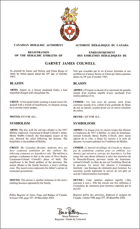 CimierBlasonUn lion assis de gueules ceint d’une couronne murale d’or, colleté d’une guirlande de fleurs de mai au naturel, sa patte posée sur un miroir circulaire du même; SymbolismeL’Autorité héraldique du Canada ne dispose pas de symbolisme confirmé pour cet emblème. Les données qui suivent ne sont que des hypothèses. Le lion rouge fait sans doute référence à celui des armoiries de la Nouvelle-Écosse, province natale du lieutenant-colonel Colwell. La fleur de mai est l’emblème floral de la province. Le miroir fait allusion à l’entreprise familiale : une boutique de vêtements pour hommes. La couronne murale représente le service de son père au sein de l’administration municipale. |