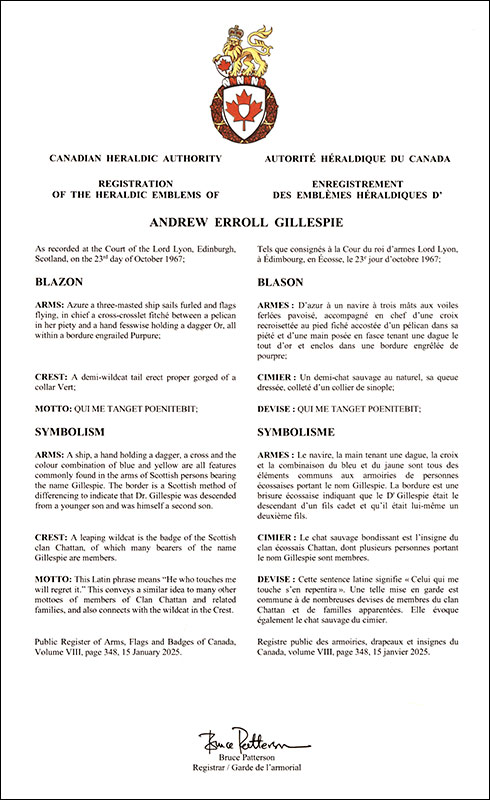Armoiries d'Andrew Erroll GillespieBlasonD’azur à un navire à trois mâts aux voiles ferlées pavoisé, accompagné en chef d’une croix recroisettée au pied fiché accostée d’un pélican dans sa piété et d’une main posée en fasce tenant une dague le tout d’or et enclos dans une bordure engrêlée de pourpre; SymbolismeLe navire, la main tenant une dague, la croix et la combinaison du bleu et du jaune sont tous des éléments communs aux armoiries de personnes écossaises portant le nom Gillespie. La bordure est une brisure écossaise indiquant que le Dr Gillespie était le descendant d’un fils cadet et qu’il était lui-même un deuxième fils. |