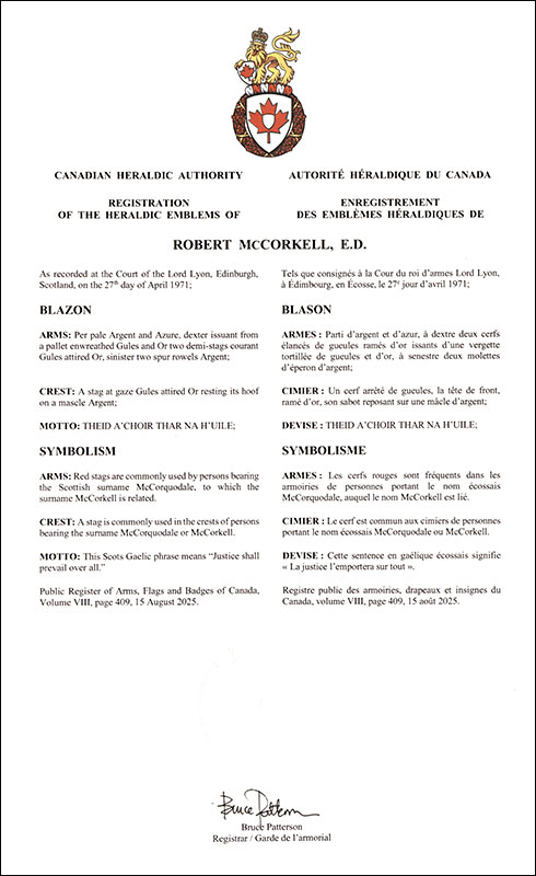 Armoiries de Robert McCorkellBlasonParti d’argent et d’azur, à dextre deux cerfs élancés de gueules ramés d’or issants d’une vergette tortillée de gueules et d’or, à senestre deux molettes d’éperon d’argent; SymbolismeLes cerfs rouges sont fréquents dans les armoiries de personnes portant le nom écossais McCorquodale, auquel le nom McCorkell est lié. |
