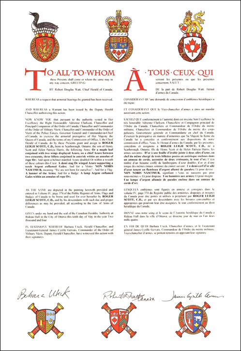 Armoiries de Roger Leigh ScottBlasonD'or à une feuille d'érable jointe à deux ailes d'azur, au chef du même chargé de trois billettes posées en astérisque encloses dans un anneau de corde, accostées de deux croissants, le tout d'or; SymbolismeL’écu reprend les couleurs des armes du chef du clan Scott. Les armes du chef comprennent une bande diagonale ornée d’une étoile à six rais entre deux croissants, lesquels figurent dans le haut de l’écu des armes de M. Scott. Ici, l’étoile à six rais est remplacée par une étoile s’inspirant de l’étoile de vie à six branches des services paramédicaux pour souligner la carrière de M. Scott comme infirmier paramédical autorisé. La corde représente les aiguillettes que portent les aides de camp (ADC) à l’épaule droite, côté désigné pour les ADC de Sa Majesté ou de ses représentants. Les ailes et la feuille d’érable rappellent son service militaire dans l’aviation au sein des Forces armées canadiennes. |